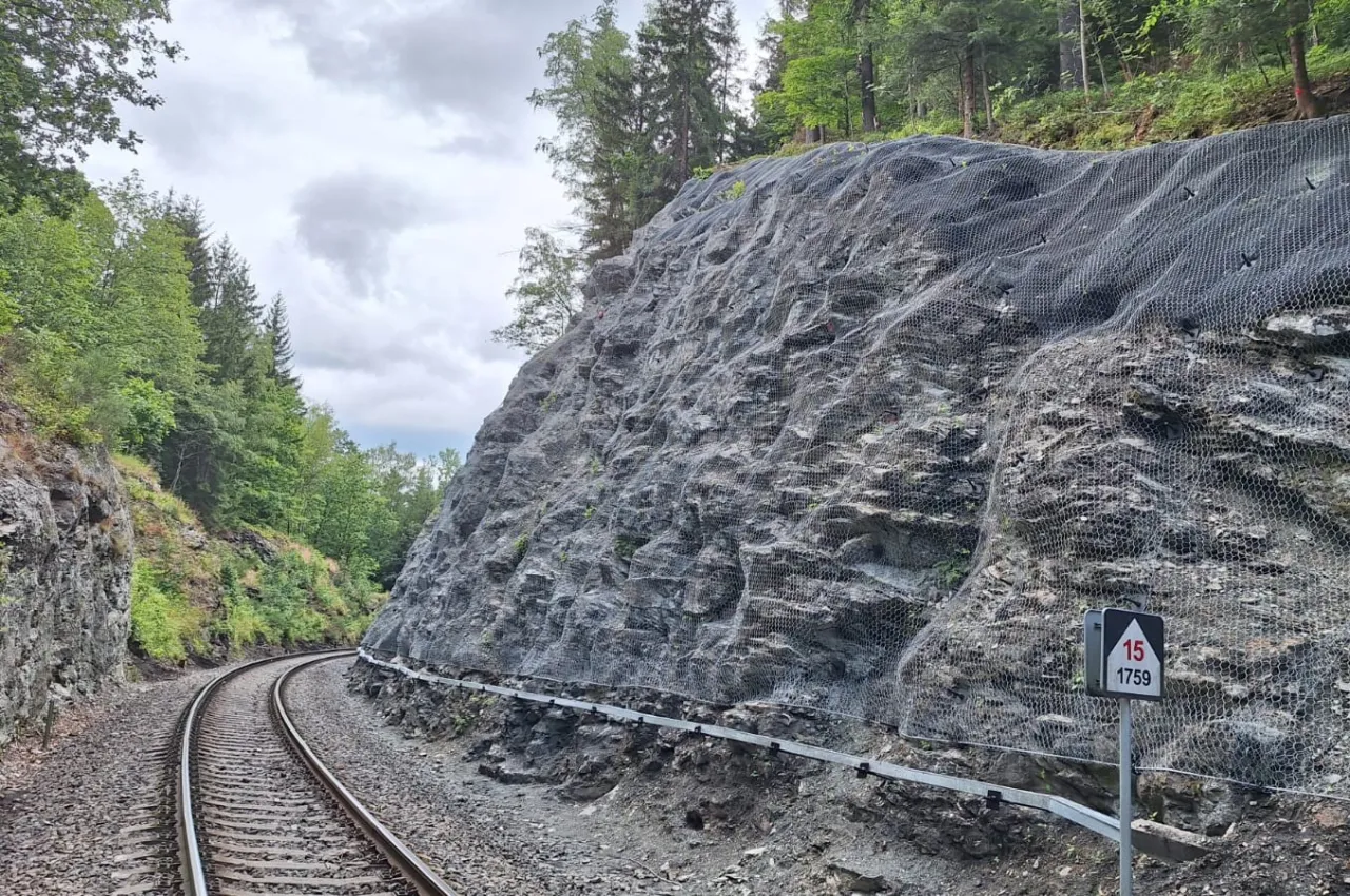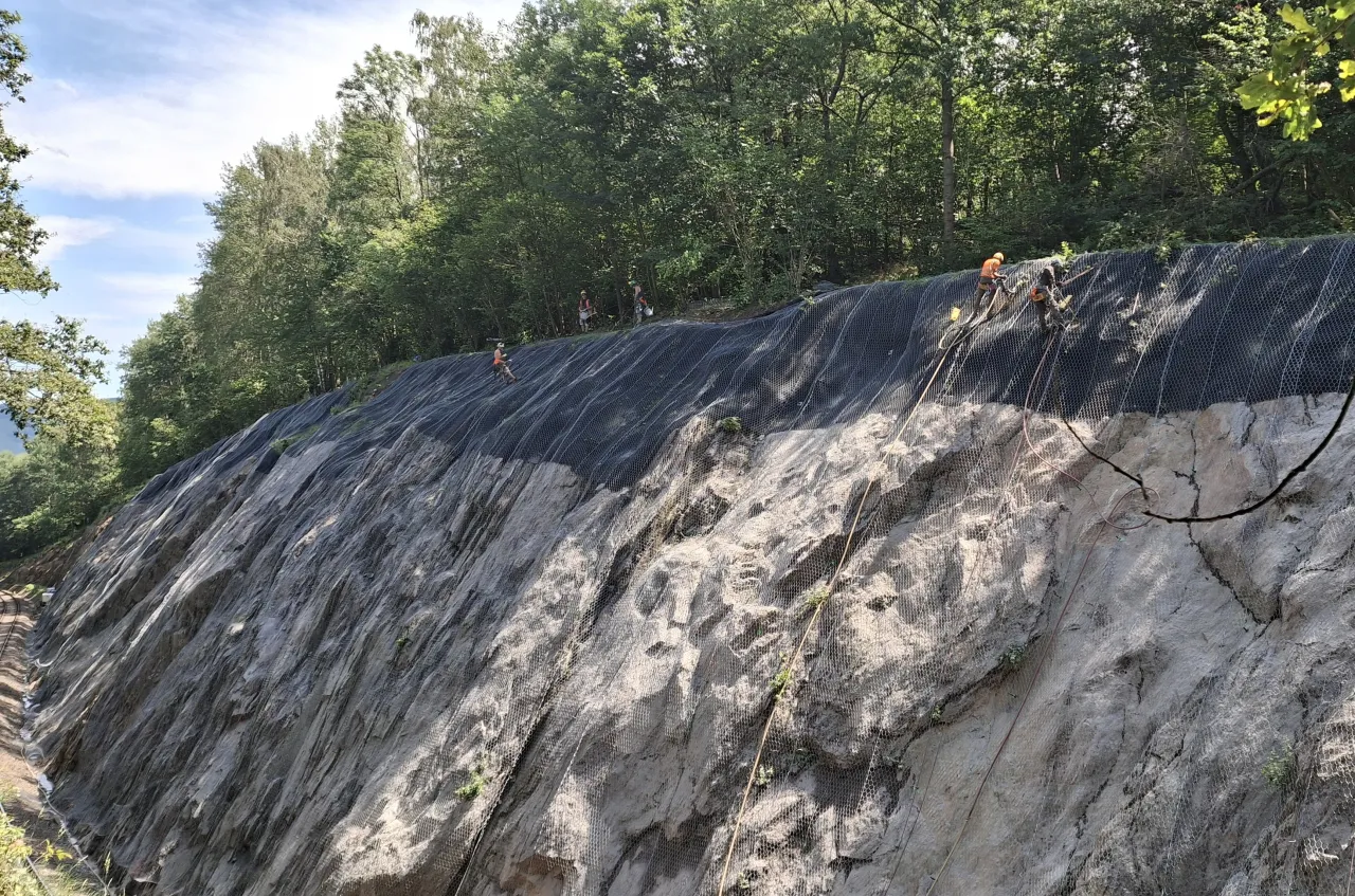 Popis realizace: Plošné očištění skalního svahu, odstranění skalních bloků, lokální kotvení, zajištění zářezu pomocí kotvené ocelové sítě a georohože.